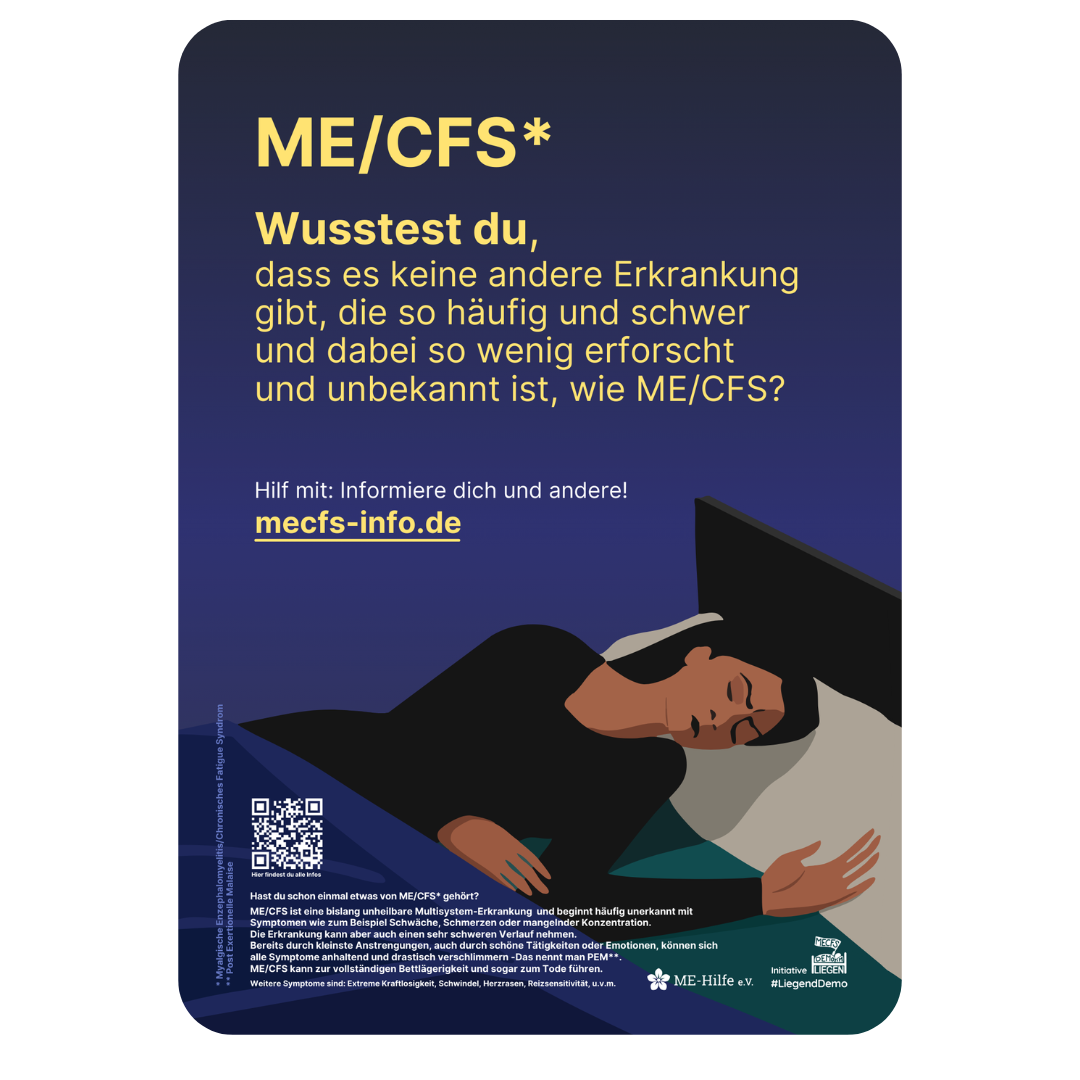 Myalgische Enzephalomyelitis (ME) ist eine schwere, chronische, neuroimmunologische Multisystemerkrankung. Sie beginnt häufig nach einem viralen Infekt (z. B. Pfeiffersches Drüsenfieber oder COVID-19) und führt oft zu einem hohen Grad körperlicher Behinderung.